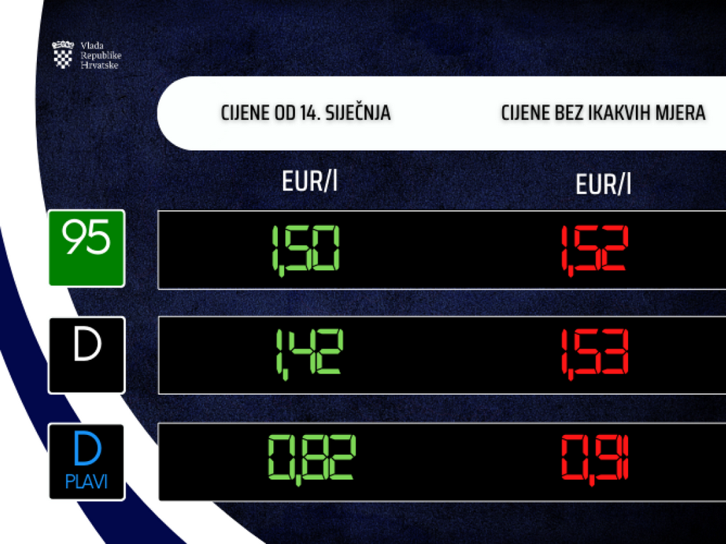 Da nema mjera Vlade te da se maloprodajne cijene u potpunosti slobodno formiraju na nivou premija energetskih subjekata prije prve Uredbe, one bi iznosile 1,52 eura po litri za benzinsko gorivo, 1,53 eura po litri za dizelsko gorivo, 0,91 eura po litri za plavi dizel, 1,56 eura po kilogramu za UNP za spremnike te 2,19 eura po kilogramu za UNP za boce, naveli su iz Vlade.