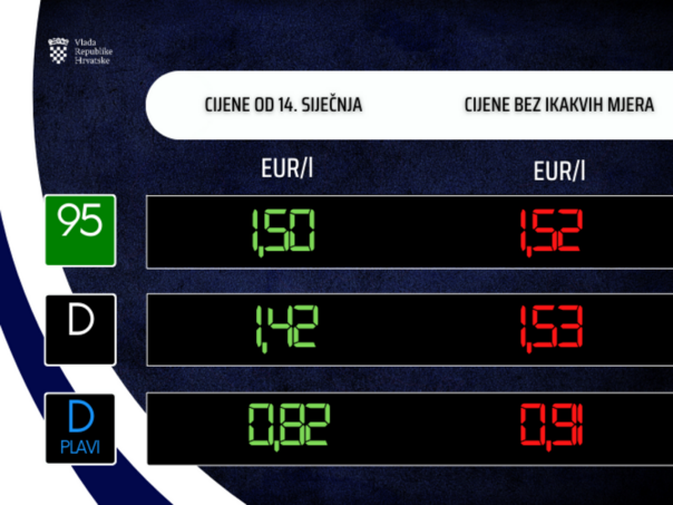 Nove cijene iznosit će 1,50 eura za litru benzinskog goriva ili tri centa više nego sada, 1,42 eura za litru dizelskog goriva, uz povećanje za dva centa, a 0,82 eura za litru plavog dizela, što je također povećanje za tri centa. Istodobno, cijene plina po kilogramu za UNP za spremnike te za UNP za boce od sutra će porasti za po četiri eurocenta, na 1,36 eura odnosno 1,90 eura.