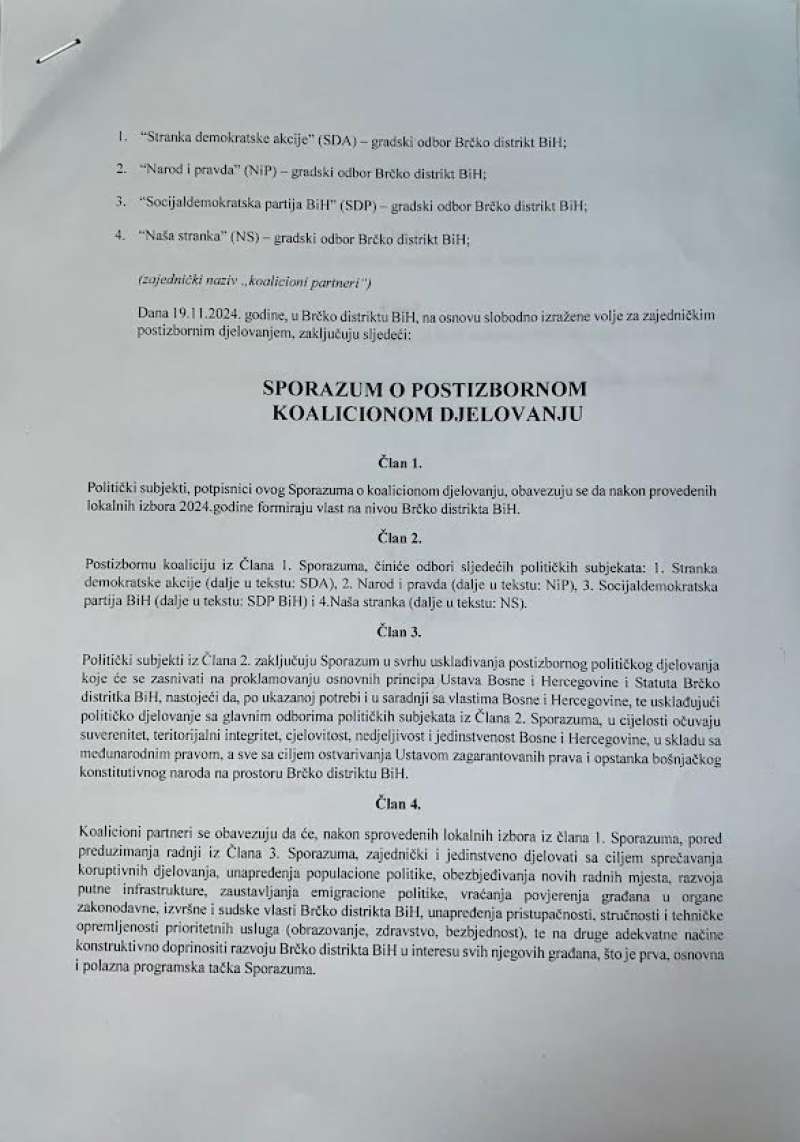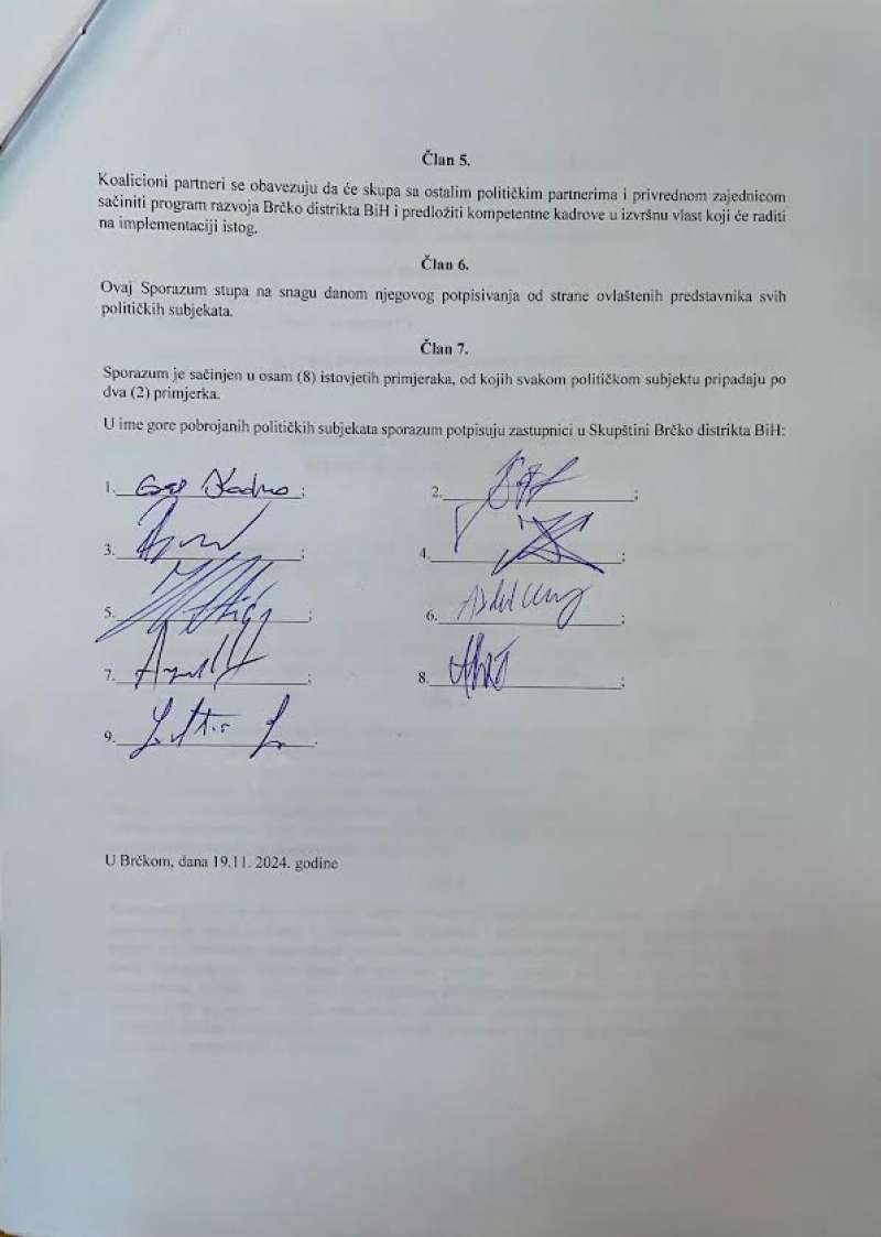 Potpisani dokument, kako se navodi, naglašava političko djelovanje u skladu s osnovnim principima Ustava BiH i Statuta Brčko distrikta BiH, kao i stabilnost i kontinuitet vlasti s posebnim fokusom na razvoj privrede, analizu i unapređenje socijalnih davanja te poboljšanja u oblastima zdravstva i obrazovanja.