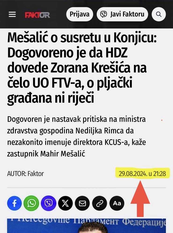 “Imamo manje od 48 sati do sjednice Predstavničkog doma Parlamenta FBiH zakazane za 02.04.2025., gdje je predviđeno da se bira, između ostalih, član Upravnog odbora FTV Zoran Krešić, koji bi postao i predsjednik UO FTV.