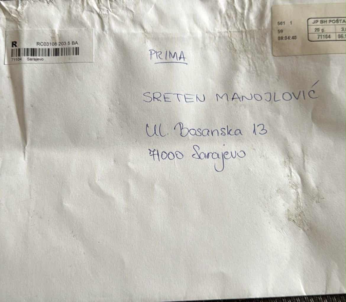 Prema operativnim informacijama, Erduan Kafedžić je dana 06.10.2025. godine, u 08:04:09 sati iz sarajevske pošte 71104 poslao prijeteće pismo Sretenu Manojloviću, broj pošiljke: RC031082035BA. Ovaj portal je preko sigurnosnih agencija uspio dobiti primjerak skinute pošiljke, koju preporučenom poštom šalje Erduan Kafedžić, Sretenu Manojloviću.
